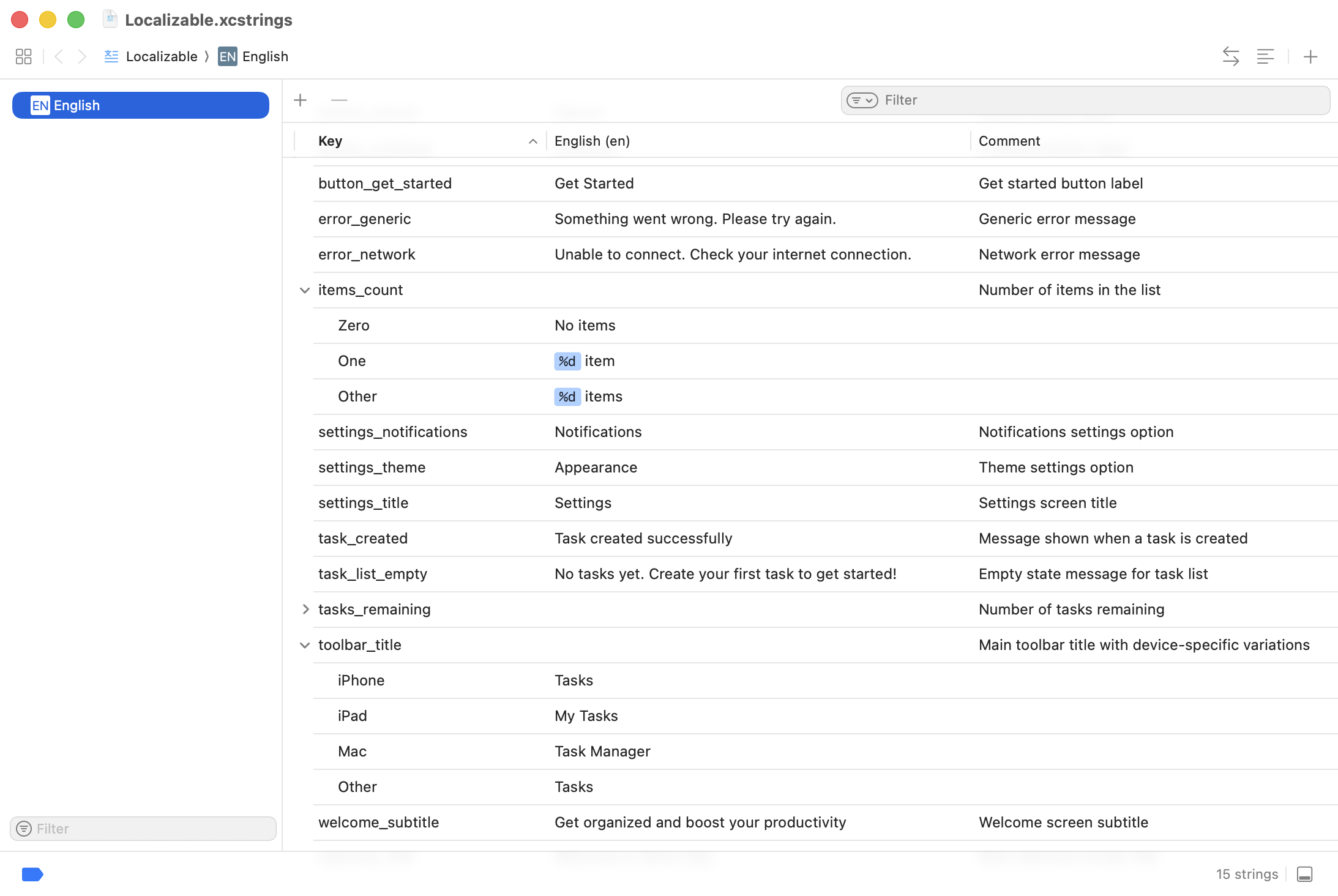 - Export — Use Xcode's Product → Export Localizations to create