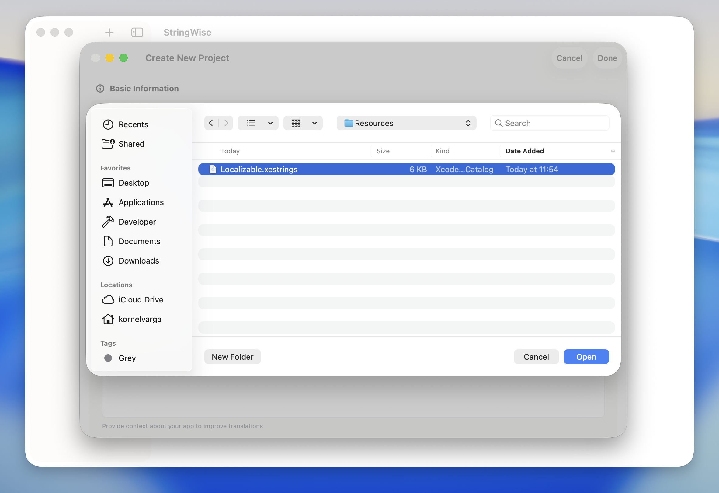 - Project folder (recommended) — Select your entire Xcode project folder. This enables Smart Context, which analyzes your Swift/ObjC code to understand string usage.