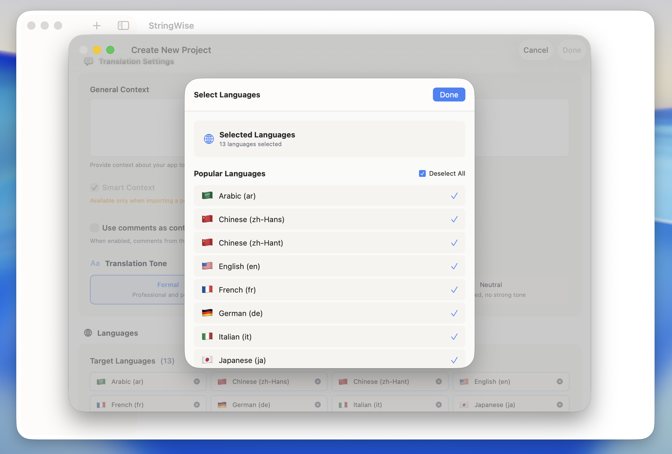 StringWise automatically generates the correct forms for each target language. You don't need to manually specify which categories to translate.